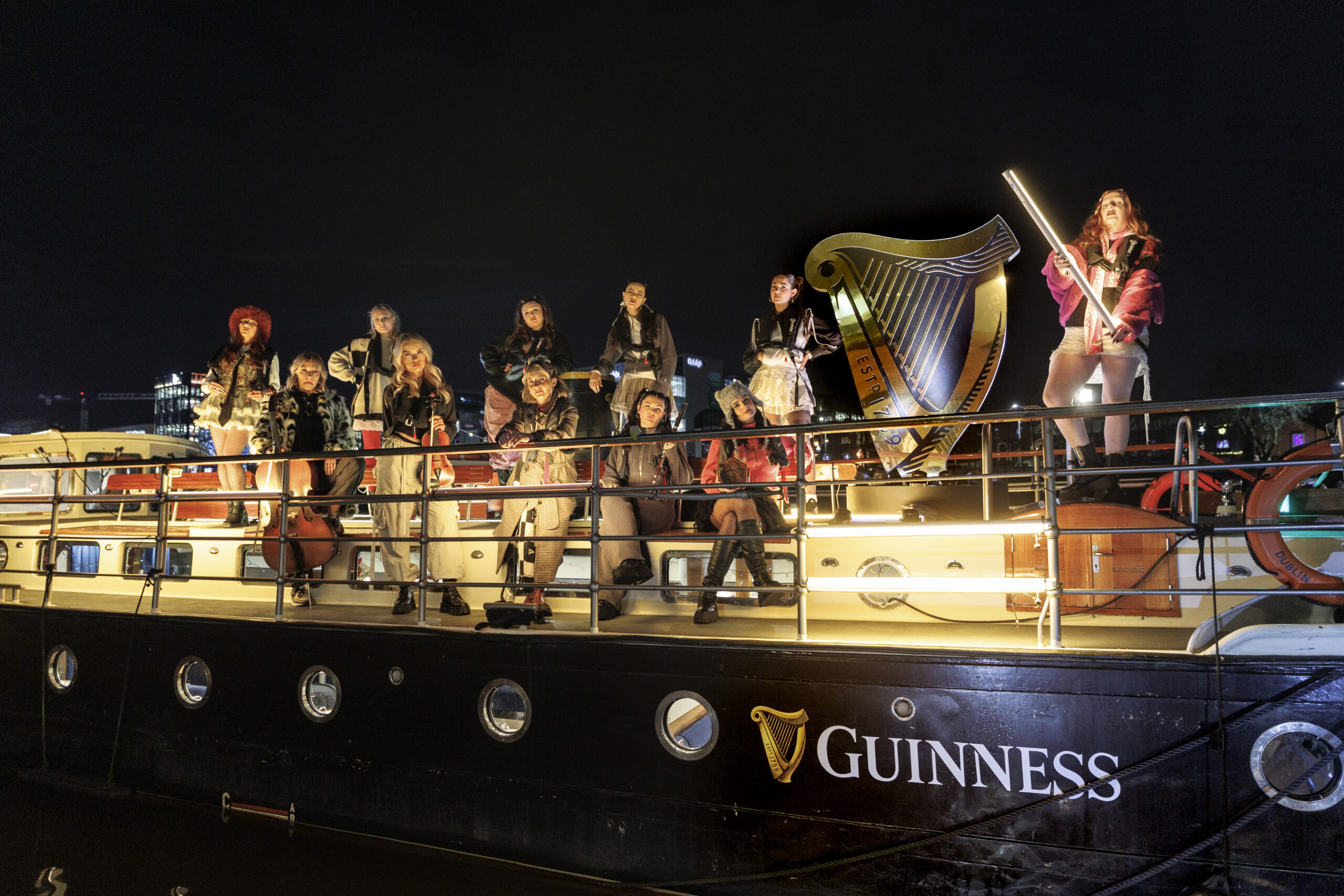 Members of Irish folk group BIIRD on the ceremonial Guinness barge to celebrate Guinness returning to 3Arena